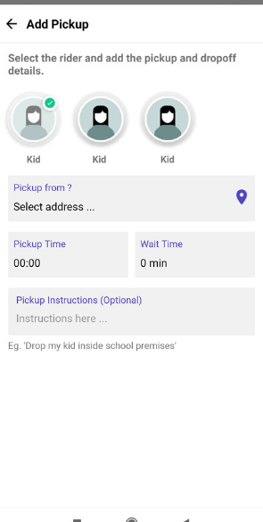 Step 7: Add the “Pickup Address” for this kid along with “Pick-Up Time”. You can also add “Wait Time” and “Additional Pick Up Instructions” if required.